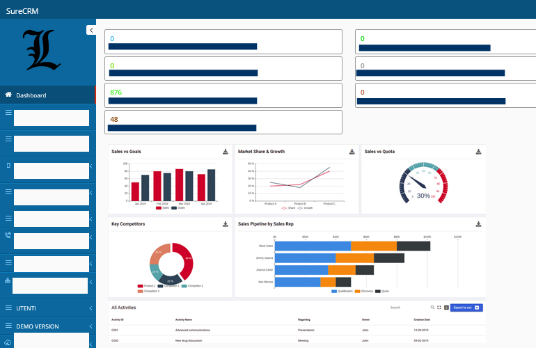 SureCRM si può configurare per tutte le tipologie di aziende ed è possibile digitalizzare l'intero processo produttivo ed analitico per avere sempre con sè il monitor della propria azienda. Si possono creare vari livelli di accesso che permettono di rispettare i ruoli aziendali dando a ciuscuno la possibilità di monitorare e gestire il proprio reparto.